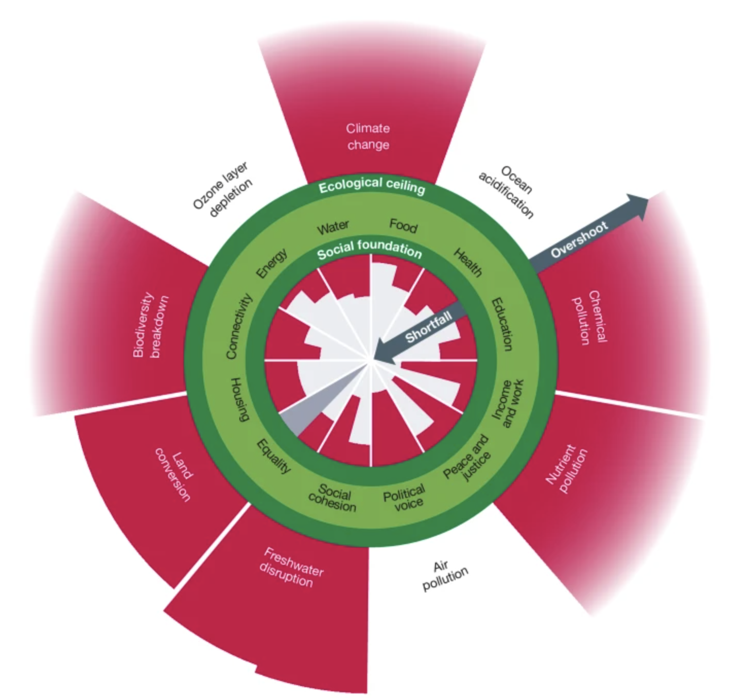 研究顯示,儘管全球GDP在此期間翻倍,人類的基本需求僅略有改善;若要在2030年前滿足所有人的基本需求,各項社會指標進步速度必須提升約五倍。然而,與此同時,地球生態系統的惡化速度仍在加快。若要在2050年前讓地球回到安全範圍內,各項生態指標(如氣候變遷、海洋酸化等)的恢復速度必須達到目前的兩倍以上。