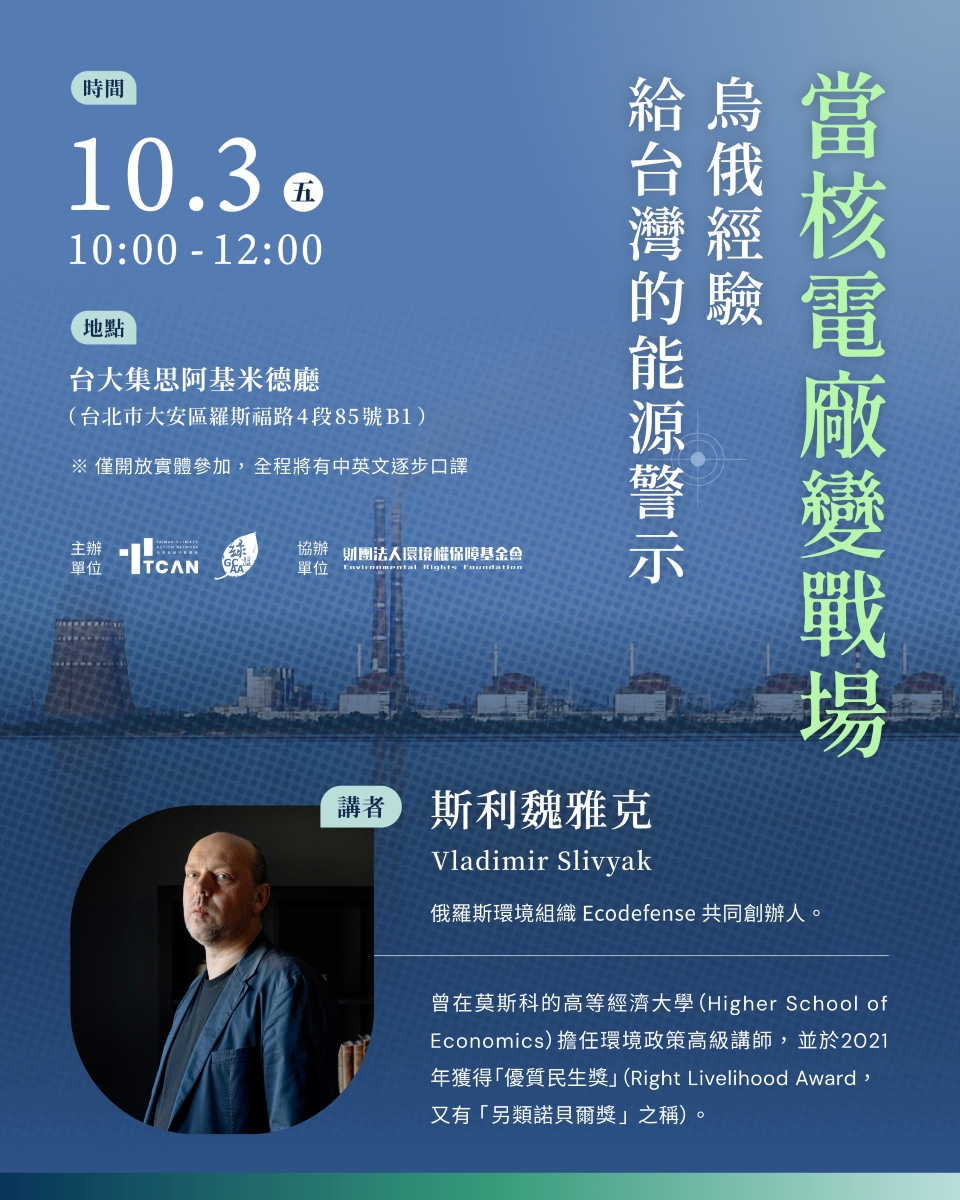 此外,在氣候危機減緩方面,斯利魏雅克也強調,除了舊核能既有的風險和核廢料處置問題仍未解以外,新核能尚未獲得充足的驗證,新增風險不可忽視,且極為昂貴,不宜作為氣候解方。台灣氣候行動網絡研究中心特別邀請斯利魏雅克在訪台期間,藉由本次講座解析核能設施在戰火下的各式風險,以及真正能夠強化能源安全與國家安全之道。